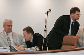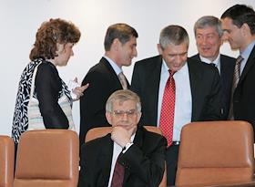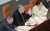 Председатель Центрального Банка России Сергей Игнатьев (сидит) и первый заместитель министра финансов России Сергей Шаталов (в центре) во время заседания Совета Федерации России.