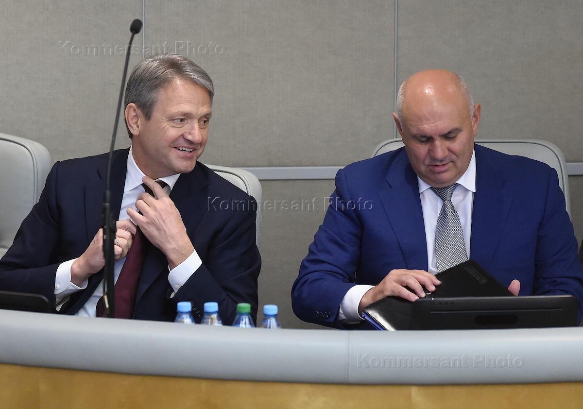 Пленарное заседание Государственной думы (ГД) России. Министр сельского хозяйства России Александр Ткачев (слева) и представитель правительства России в ГД России Александр Синенко (в центре) перед началом заседания.