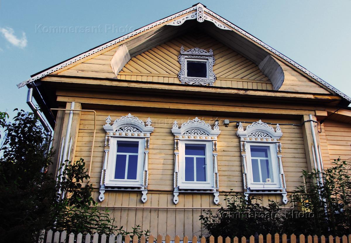 Сельская улица. Деревенский дом с резными наличниками.