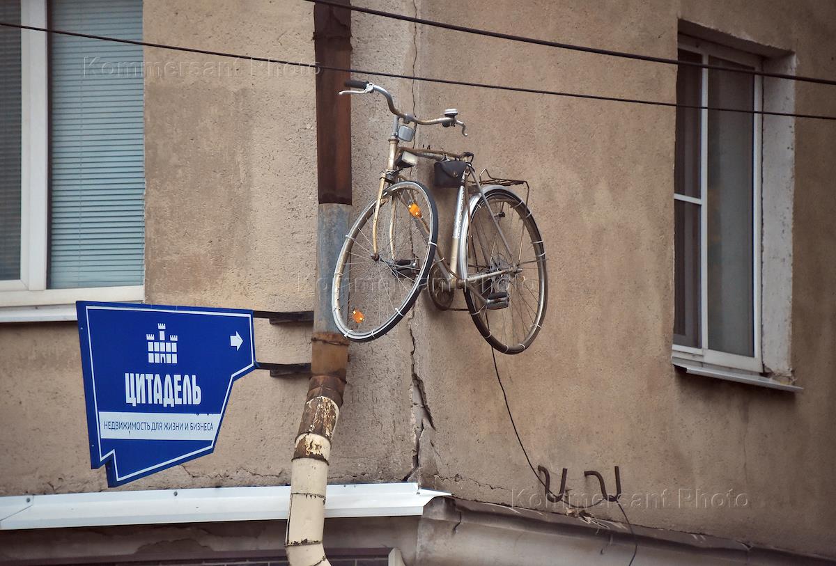 Жанровая фотография. Велосипед, прикрепленный к стене жилого дома, и вывеска агентства недвижимости "Цитадель" "недвижимость для жизни и бизнеса".