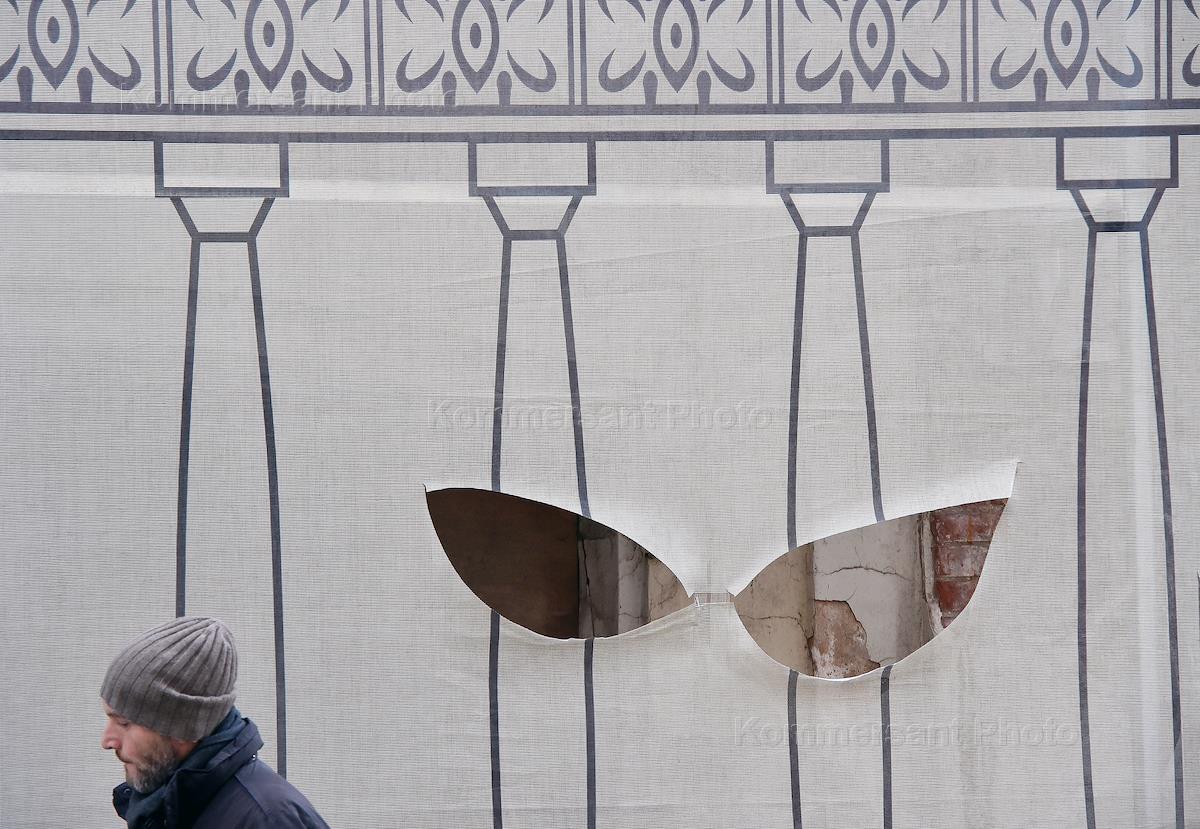 Жанровая фотография. Порванная сетка на месте реставрации фасада исторического здания.
