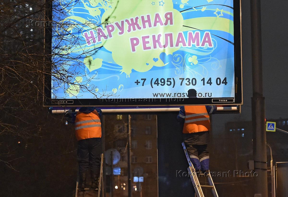 Жанровая фотография. Рабочие во время замены плаката уличной рекламы.