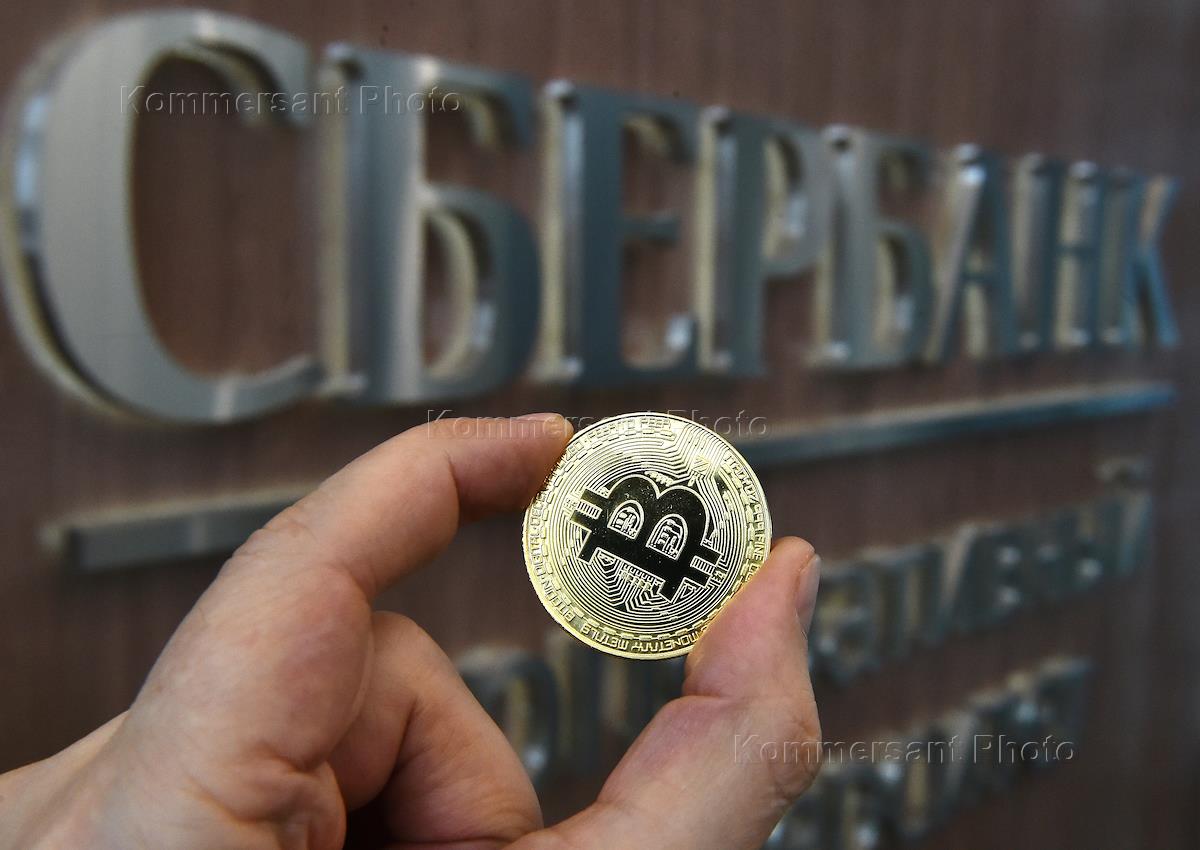 Жанровая фотография. Монета криптовалюты биткойн (bitcoin) на фоне вывески "Сбербанка".