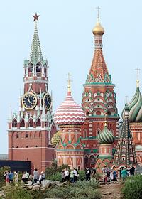 Виды Москвы. Покровский собор (Собор Василия Блаженного) и посетители ландшафтного парка "Зарядье".