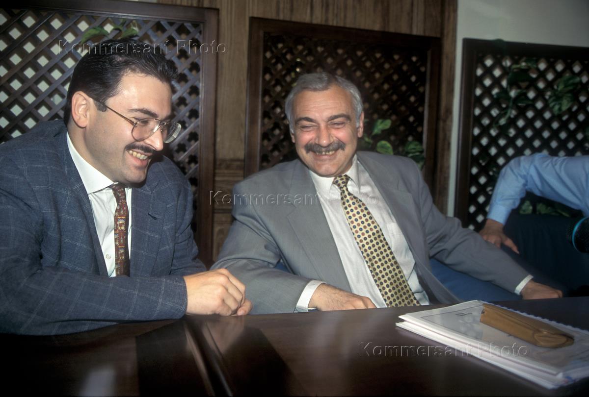 Глава банка "Менатеп" Михаил Ходорковский (слева) и президент "НК ЮКОС" Сергей Муравленко (справа) после принятия решения о приобретении банком "Менатеп" компании "НК ЮКОС".