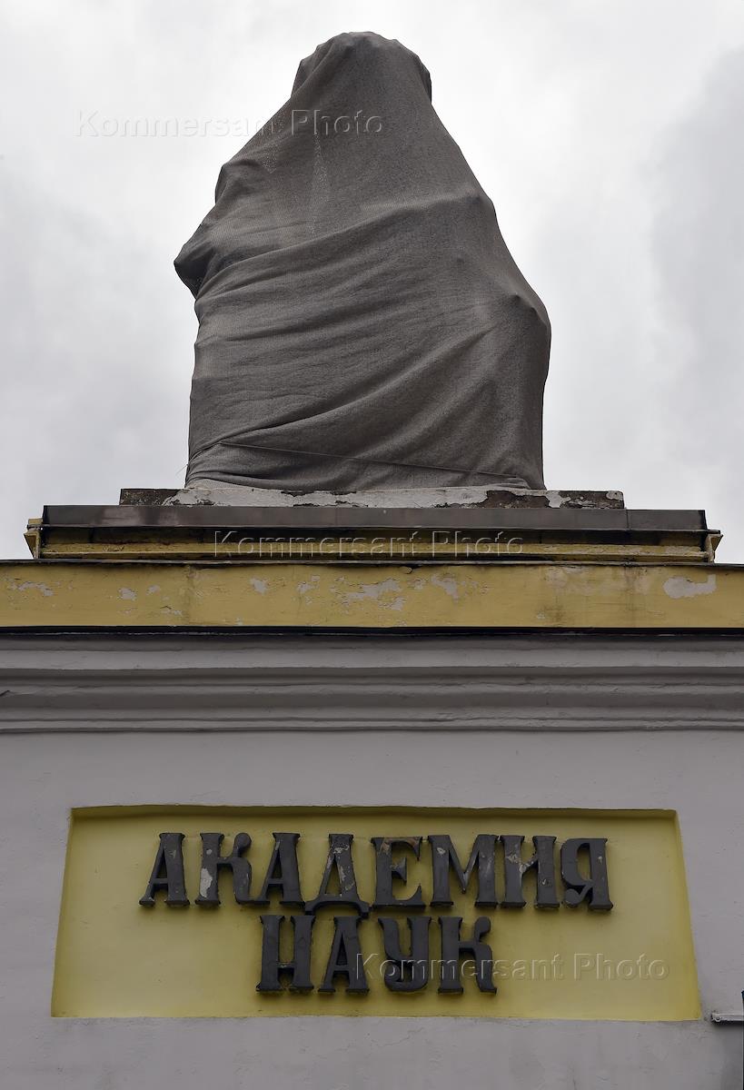 Жанровая фотография. Въезд на территорию Президиума Российской Академии наук (РАН). Закрытая полотном скульптурная группа на колонне въезда.