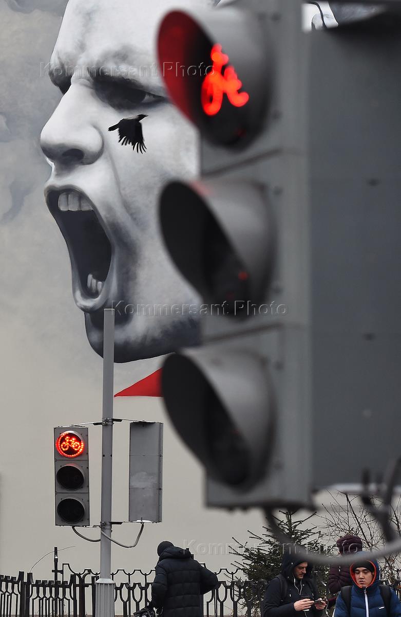Жанровая фотография. Граффити "кричщий человек" и красный свет у светофора.