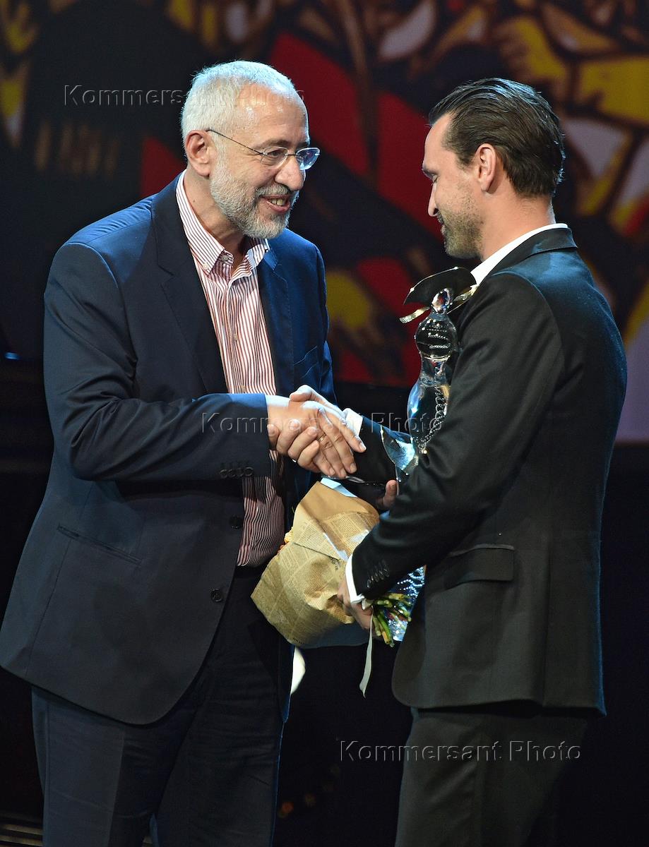 XXVI церемония вручения Первой театральной премии "Хрустальная Турандот" в Государственном академическом театре имени Евгения Вахтангова. Директор Московского театра "Ленком" Марк Варшавер (в центре) и актер Игорь Миркурбанов (справа) на церемонии.