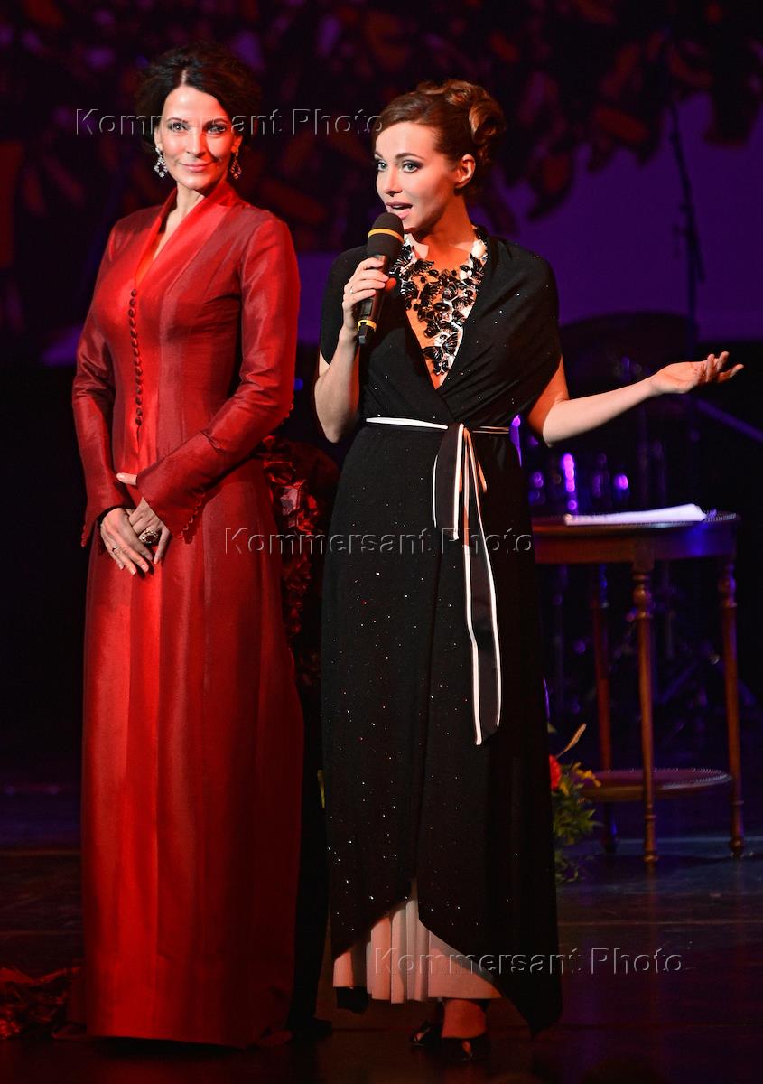 XXVI церемония вручения Первой театральной премии "Хрустальная Турандот" в Государственном академическом театре имени Евгения Вахтангова. Актрисы Евгения Крюкова (слева) и Екатерина Гусева (спарва) на церемонии.