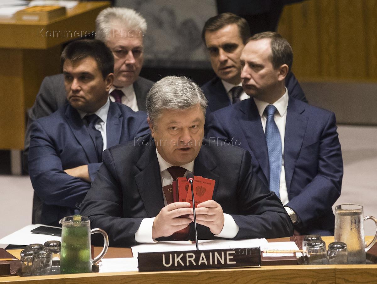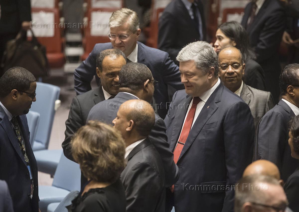 Президент Украины Петр Порошенко (в центре) во время заседания Совета безопасности ООН по миротворчеству на уровне глав делегаций в штаб-квартире ООН.