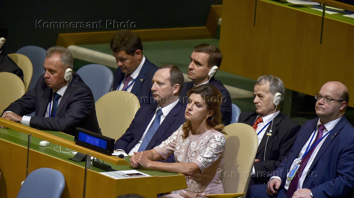 Заседание Совета безопасности ООН по миротворчеству на уровне глав делегаций в штаб-квартире ООН. Супруга президента Украины Петра Порошенко Марина (третья справа) и уполномоченный по делам крымско-татарского народа Мустафа Джемилев (2й справа) во время заседания.
