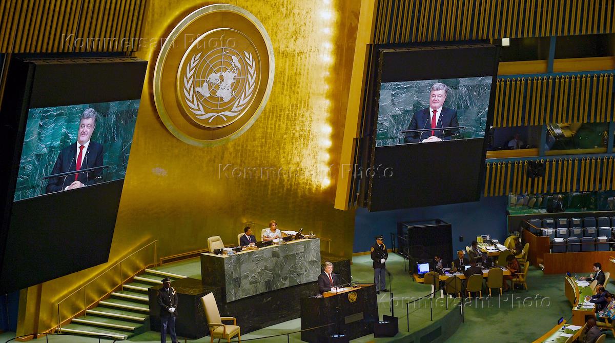 Заседание Совета безопасности ООН по миротворчеству на уровне глав делегаций в штаб-квартире ООН. Президент Украины Петр Порошенко во время выступления.