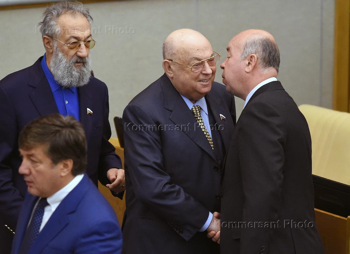 Пленарное заседание Государственной думы (ГД) России. Член комитета ГД по международным делам Артур Чилингаров (слева) перед началом заседания.