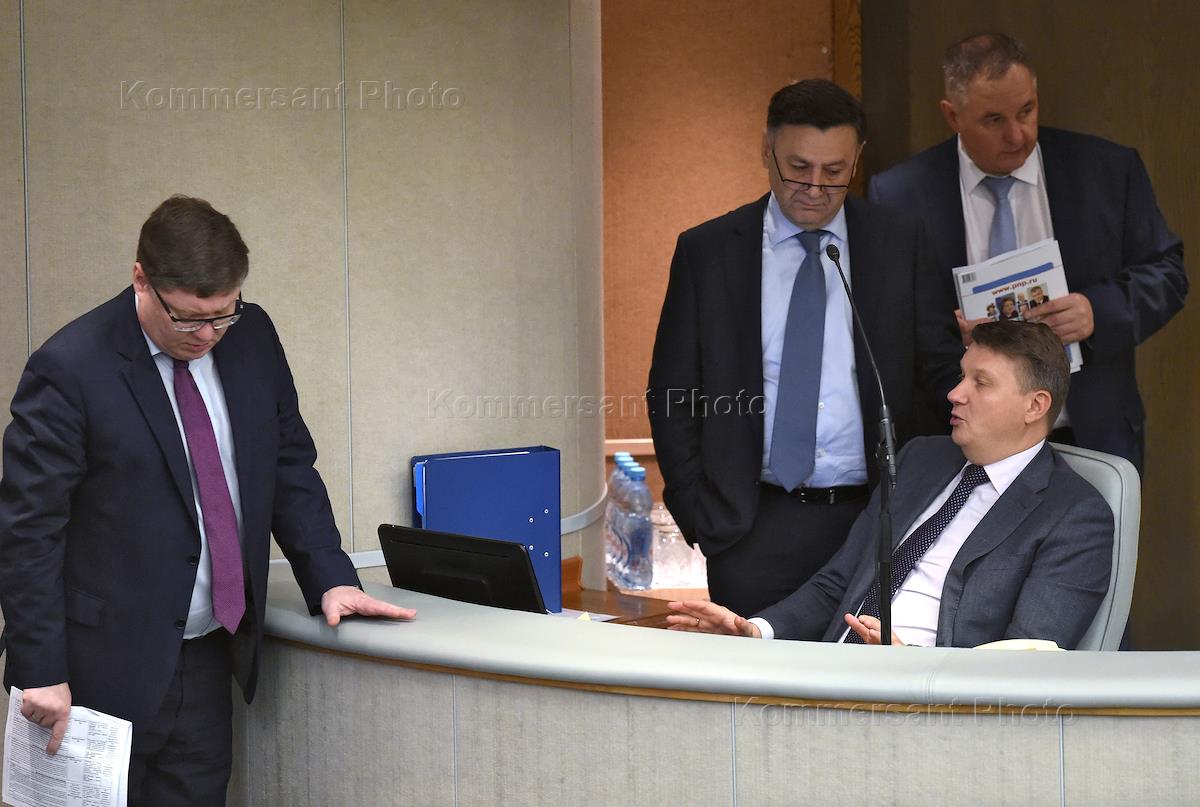 Пленарное заседание Государственной думы (ГД) России. Слева направо: председатель комитета ГД России по экономической политике, промышленности, инновационному развитию и предпринимательству Сергей Жигарев, заместитель председателя ГД России Игорь Лебедев и член комитета ГД России по транспорту и строительству Ярослав Нилов перед началом заседания.
