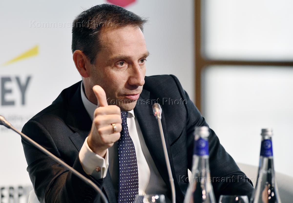 XXVII ежегодная деловая и инвестиционная конференция Американской торговой палаты в России (AmCham Russia) "Принимая новые вызовы" в гостинице Four Seasons Hotel Moscow. Председатель правления Московской биржи Александр Афанасьев во время заседания конференции.