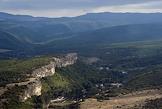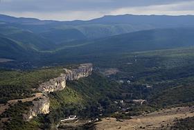 Виды Крыма. Горные склоны и надпись "МИР" (справа).