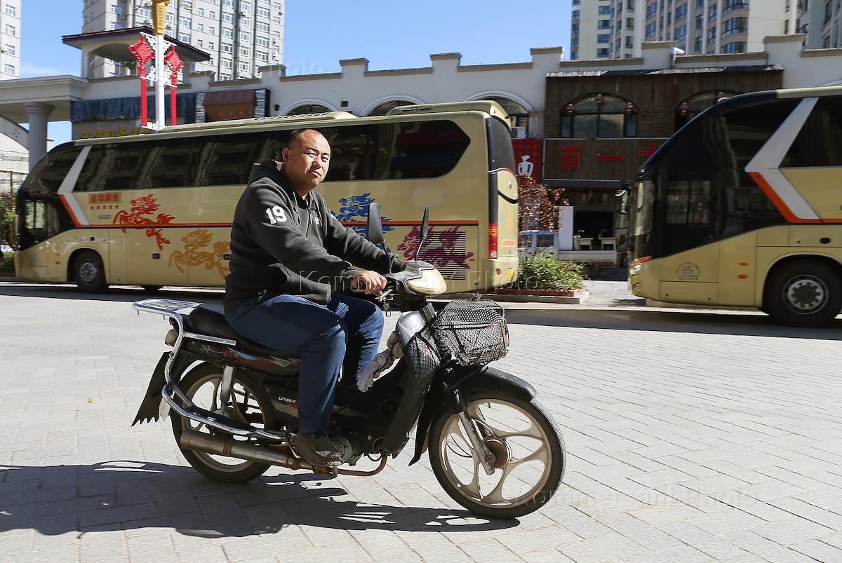 Виды города Фуюань. Жанровая фотография. Мужчина едет на мотоцикле по городу.