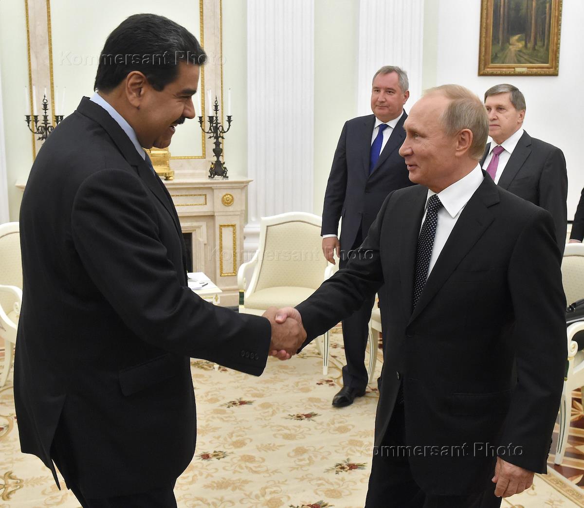 Президент России Владимир Путин (справа) и президент Венесуэлы Николас Мадуро (слева) во время встречи в Кремле. Заместитель председателя правительства России дмитрий Рогозин (в центре) и помощник президента России Юрий Ушаков (справа) во время встречи.
