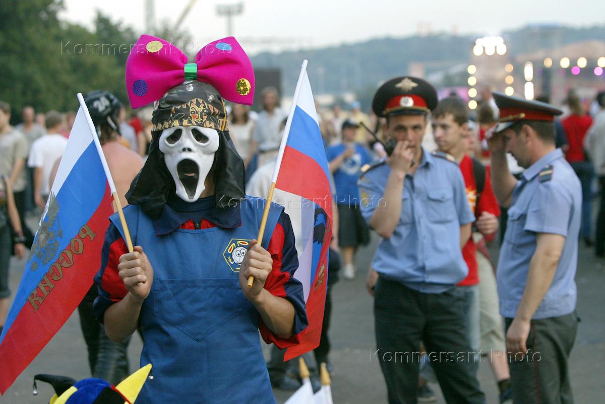 Продавец сувениров в маске из фильма "Крик" на рок-фестивале "Крылья". Фестиваль прошел в спорткомплексе "Лужники".