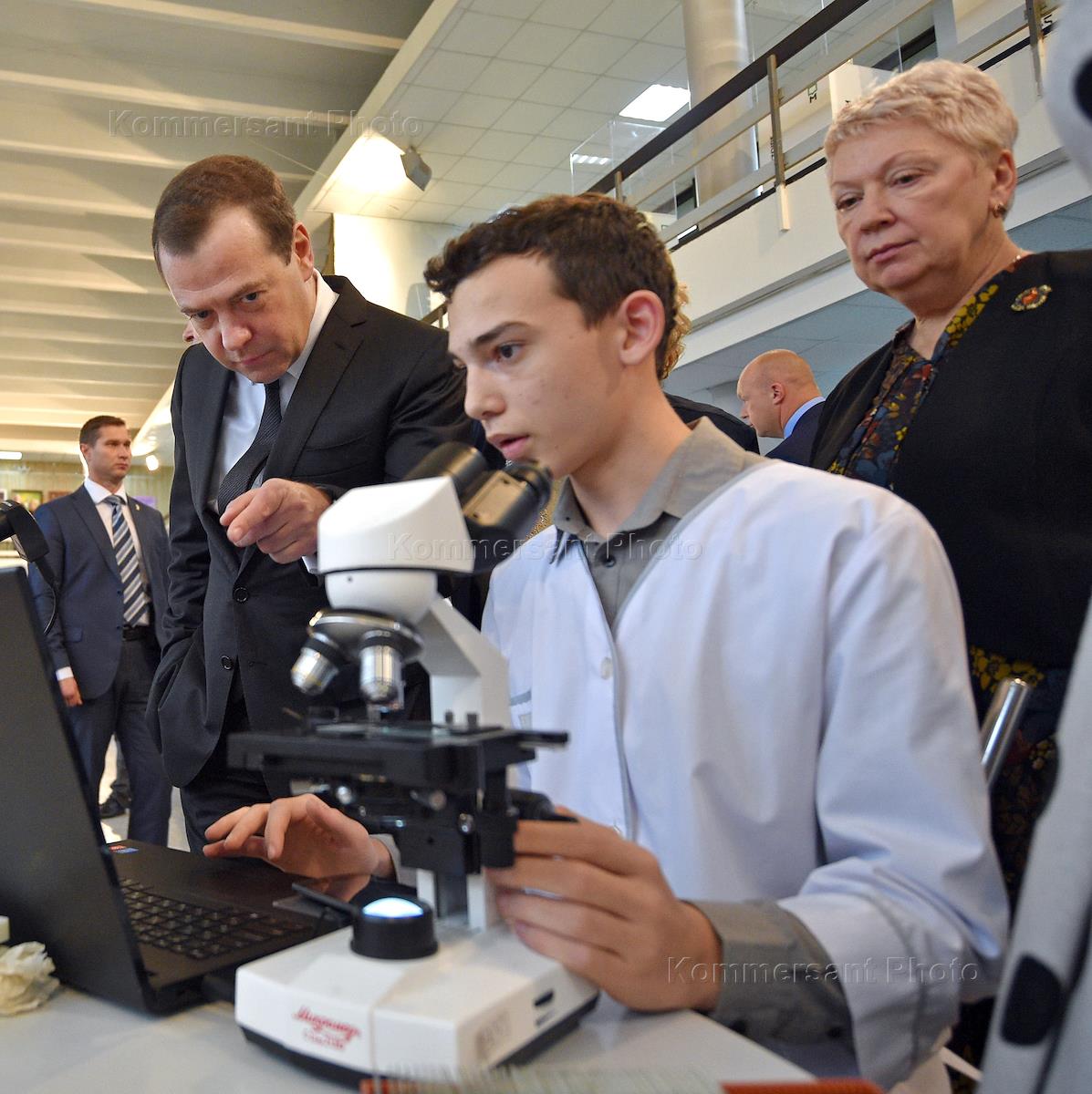 Председатель правительства Дмитрий Медведев (в центре) во время посещения образовательного комплекса "Воробьевы горы" (бывший Дворец пионеров) .