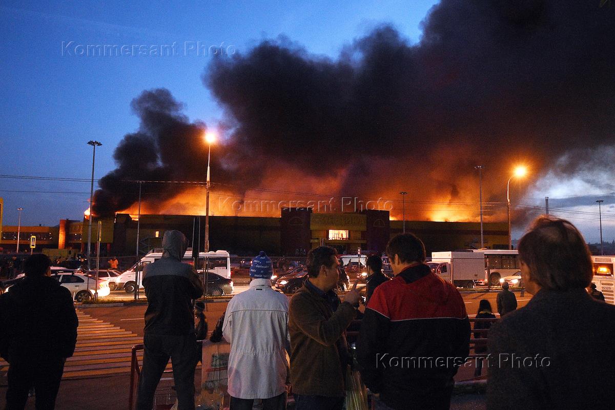 Прохожие во время пожара на строительном рынке "Синдика" на МКАД.