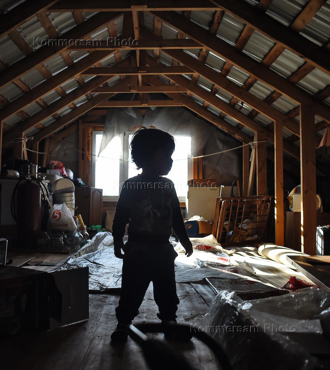 Семья переселенцев из Таджикистана Джураевых в селе Легково. Маленький ребенок на крыше дома.