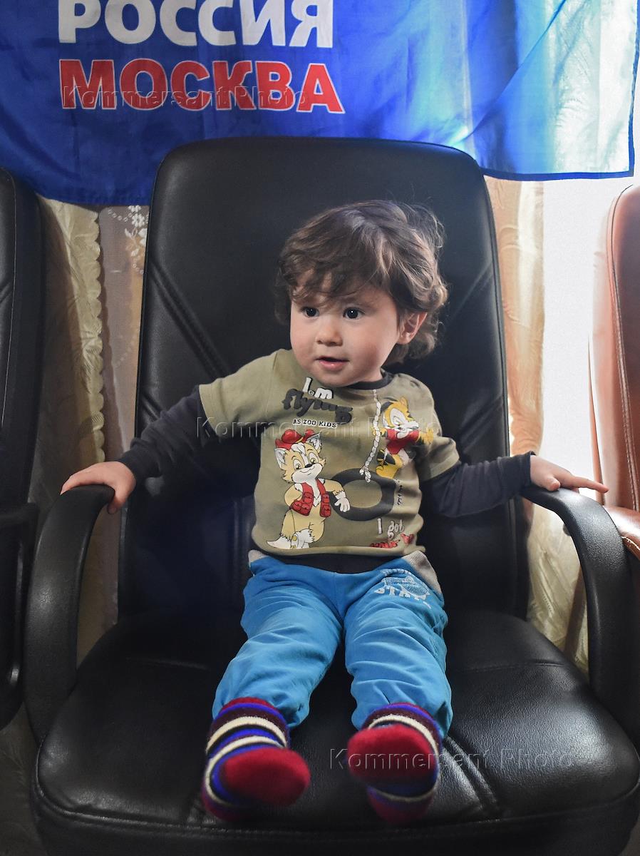 Семья переселенцев из Таджикистана Джураевых в селе Легково. Маленький ребенок на кресле.