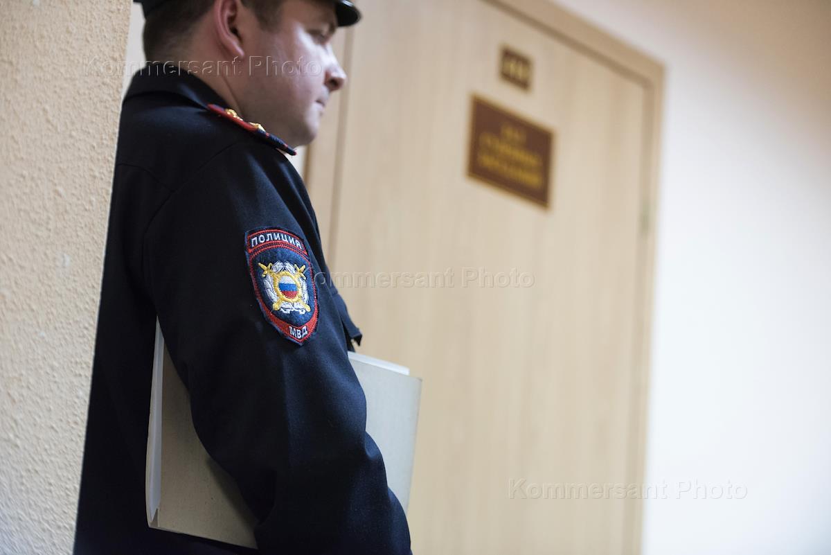 Жанровая фотография. Сотрудник полиции у двери с табличкой "Зал судебных заседаний" в Смольненском районном суде.