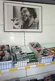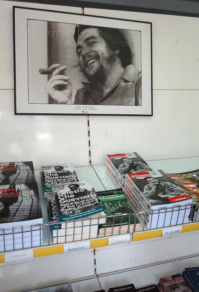 Виды Кубы. Витрина с книгами. Портрет на стене революционера Че Гевары.