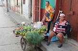 Виды Кубы. Женщина продает с лотка фрукты и зелень на улице.