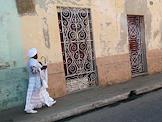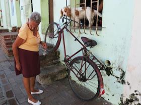 Виды Кубы. Пожилая женщина стоит на улице рядом с велосипедом, привязанным к решетки на окне. Собака выглядвает из окна.