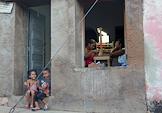 Виды Кубы. Маникюрный салон. Дети сидят на пороге салона.