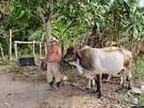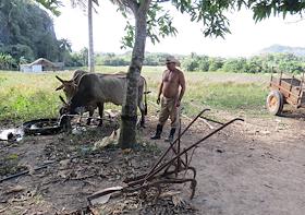 Виды Кубы. Сельскохозяйственные работа. Мужчина с коровой на банановой плантации.