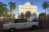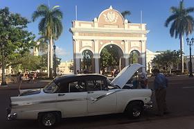 Виды Кубы. Мужчины ремонтируют на краю дороги старый американский автомобиль.
