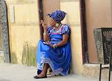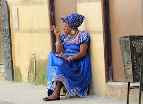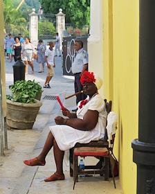 Виды Кубы. Кубинская пожилая женщина курит сигару на улице.