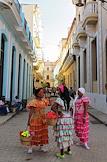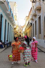 Виды Кубы. Кубинские женщины в национальных костюмах стоят на улице.
