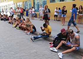 Виды Кубы. Кубинская молодежь сидит на улице на краю тротуара.