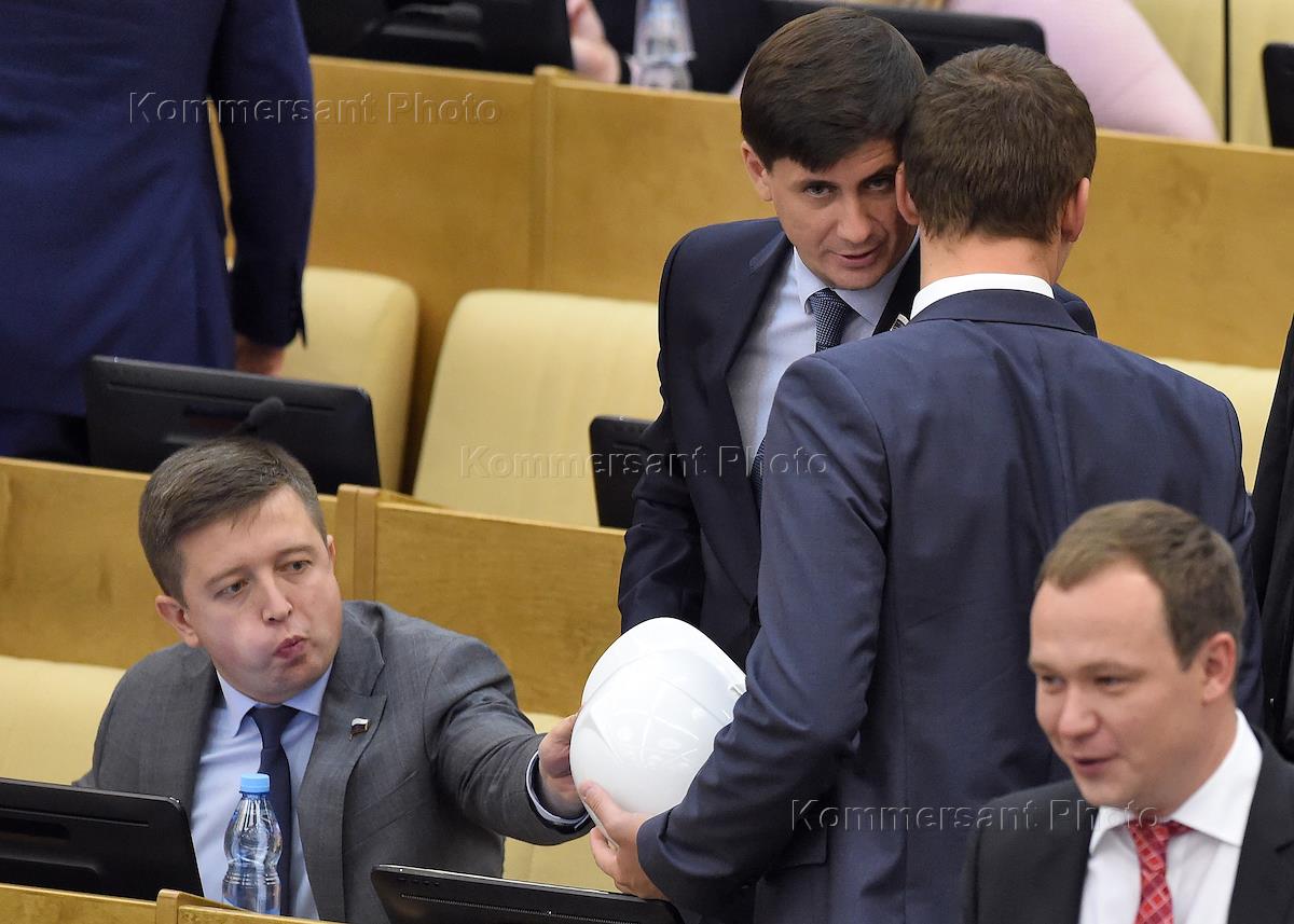 Пленарное заседание Государственной думы (ГД) России. Слева направо: член комитета ГД России по физической культуре, спорту, туризму и делам молодежи Мурат Хасанов, член ГД России по бюджету и налогам Александр Носов и член комитета ГД России по безопасности и противодействию коррупции Олег Колесников перед началом заседания.