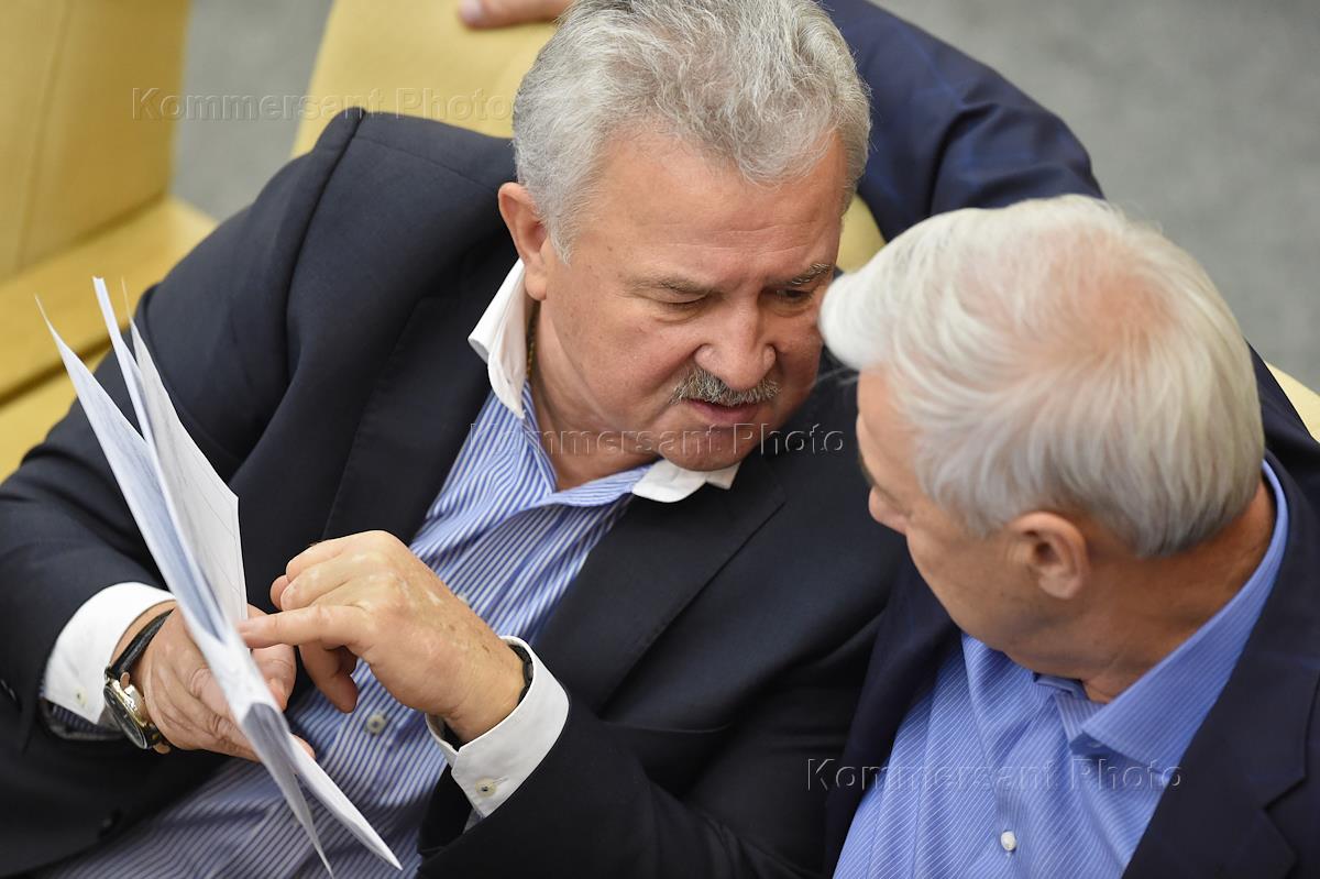 Пленарное заседание Государственной думы (ГД) России. Председатель комитета ГД России по транспорту и строительству Евгений Москвичев (слева) во время заседания.
