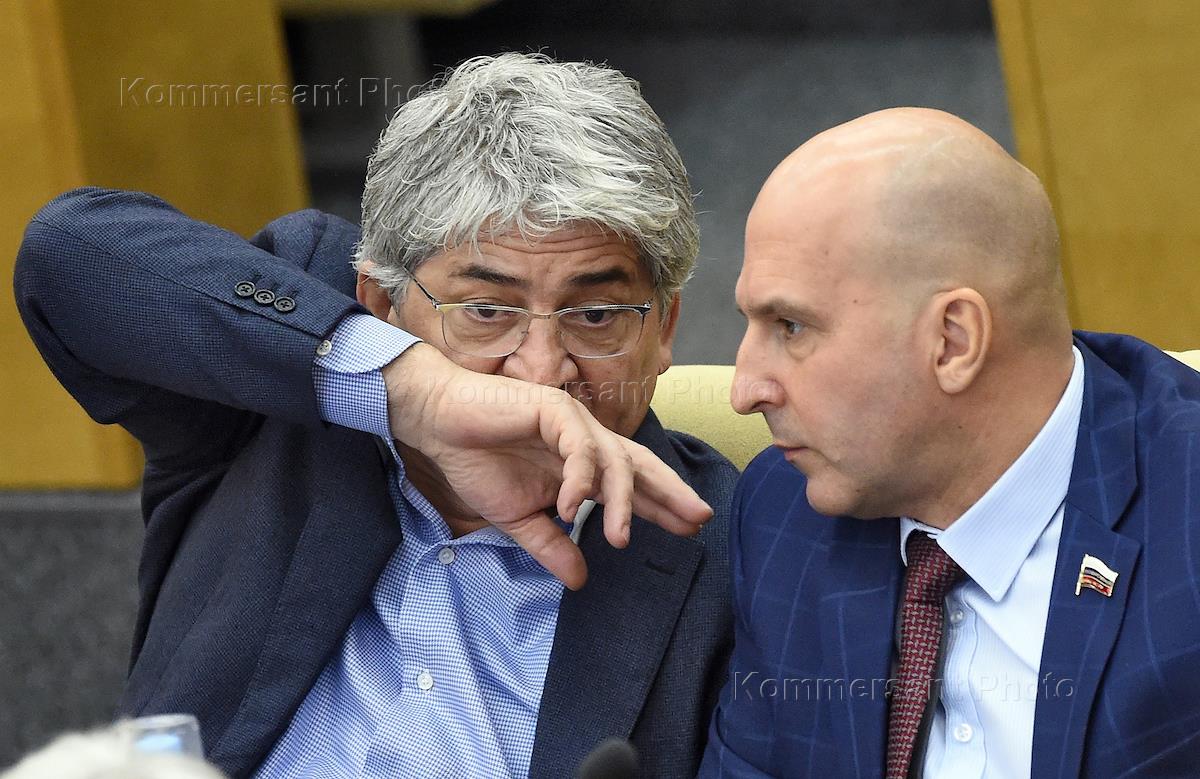 Пленарное заседание Государственной думы (ГД) России. Член комитета ГД России по транспорту и строительству Абдулгамид Эмиргамзаев (слева) и член комитета ГД России по образованию и науке Николай Земцов (справа) во время заседания.