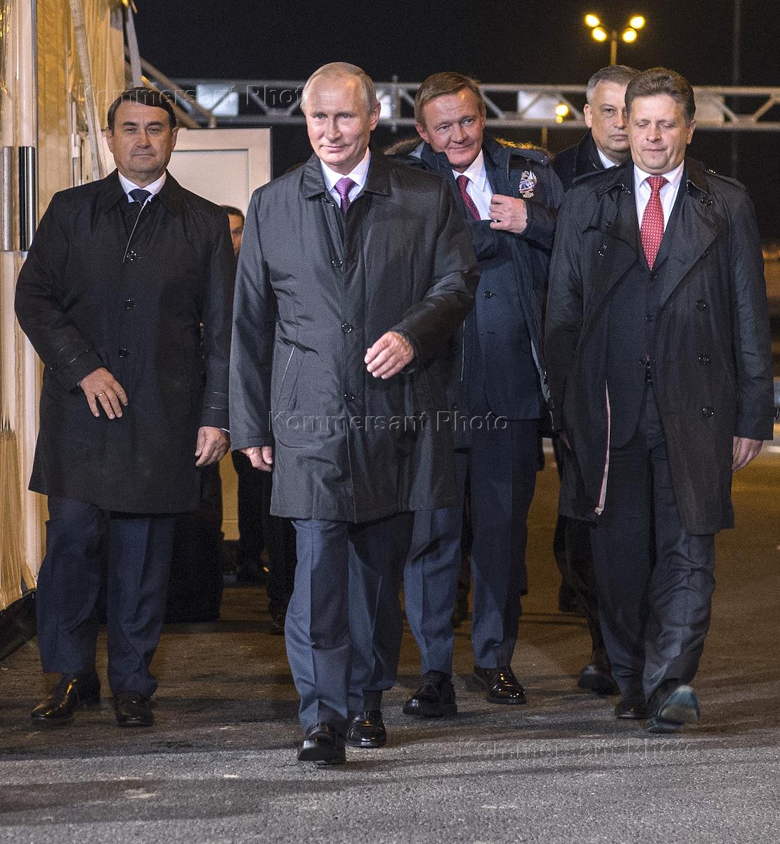 Рабочая поездка президента России Владимира Путина в Санкт-Петербург. Слева направо: помощник президента России Игорь Левитин, президент России Владимир Путин, руководитель Федерального дорожного агентства России (Росавтодор) Роман Старовойт и министр транспорта России Максим Соколов во время церемонии открытия автомобильного движения по реконструированному участку автомобильной дороги Р23, соединяющей Санкт-Петербург с Белоруссией и странами Прибалтики.