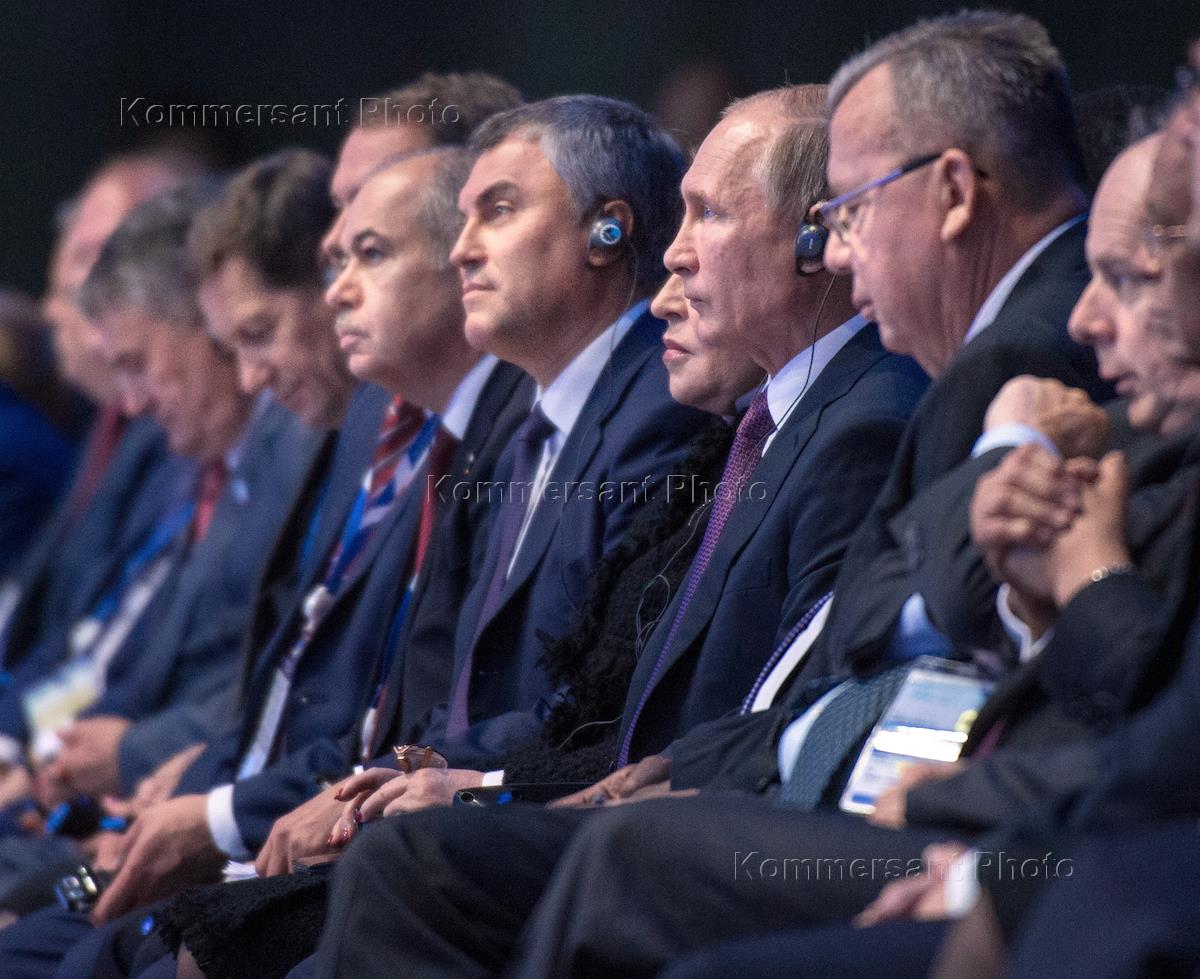 Церемония открытия 137-й Ассамблеи Межпарламентского союза в конгрессно-выставочном центре "Экспофорум". Слева направо: председатель Государственной думы России Вячеслав Володин, председатель Совета Федерации России Валентина Матвиенко и президент России Владимир Путин в перед началом церемонии.