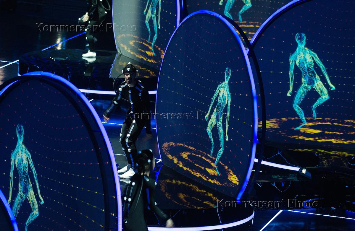 Церемония открытия XIX Всемирного фестиваля молодёжи и студентов прошла в ледовом дворце "Большой". Певец Дима Билан (в центре) и российский теоретик-кристаллограф, химик, физик, профессор Артём Оганов (слева) во время церемонии.