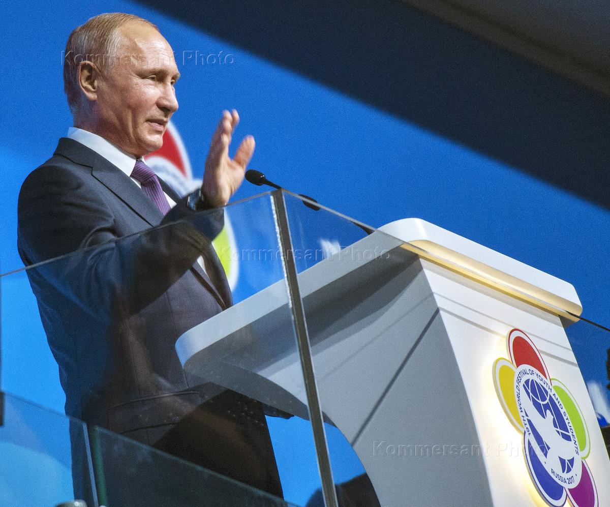 Церемония открытия XIX Всемирного фестиваля молодёжи и студентов прошла в ледовом дворце "Большой". Президент России Владимир Путин во время вытупления на церемонии.