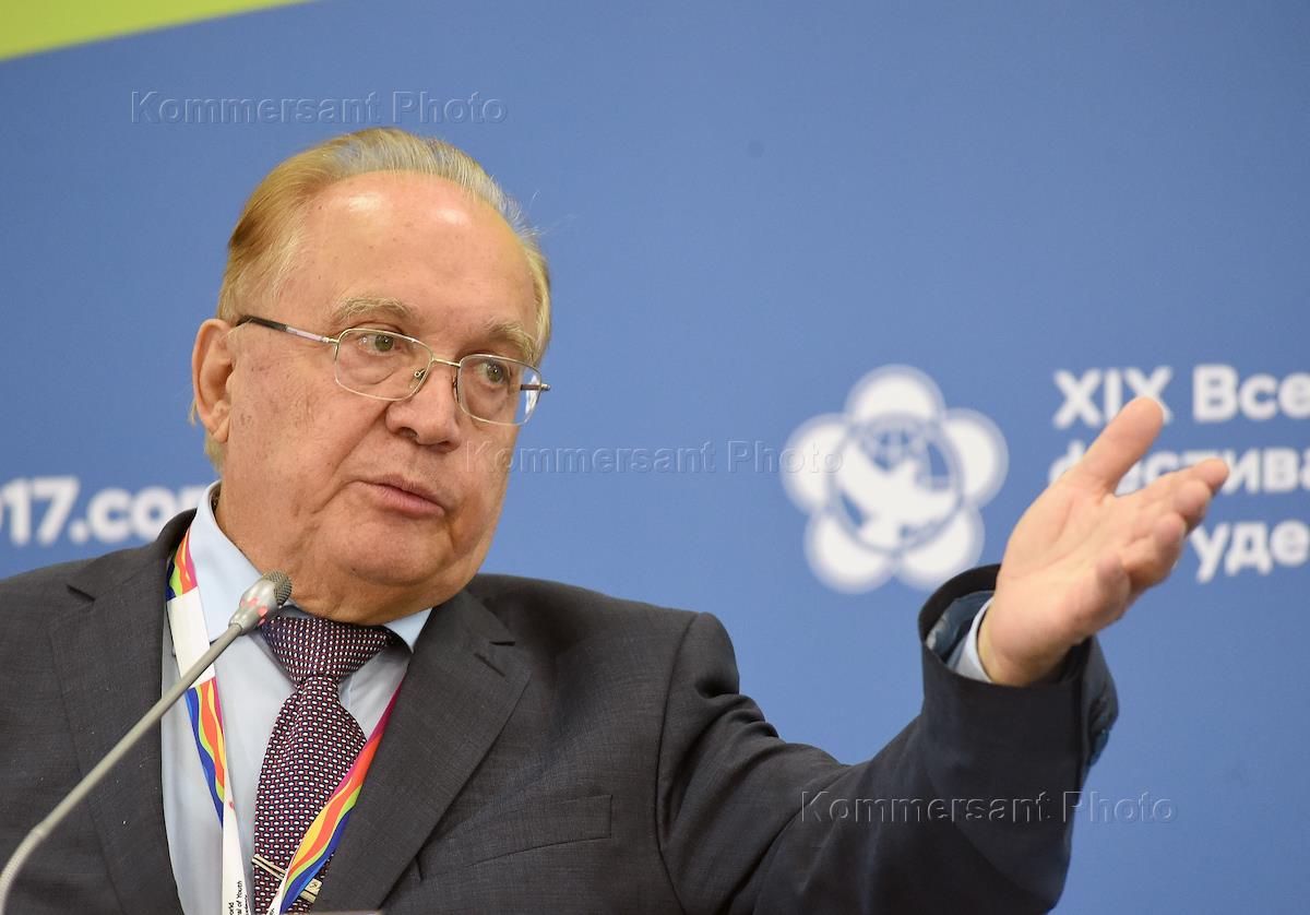 XIX Всемирный фестиваль молодежи и студентов в Сочи. День третий. Ректор МГУ имени М.В. Ломоносова Виктор Садовничий во время дискуссии на тему "Университеты в эпоху глобальных вызовов" .