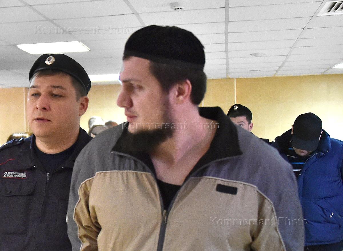 Рассмотрение по существу дела "вора в законе" Захария Калашова (Шакро Молодой) и его подельников, обвиняемых в вымогательстве, прошло в Никулинском районном суде. Обвиняемый по делу Зелимхан Патиев (в центре) перед началом заседания.