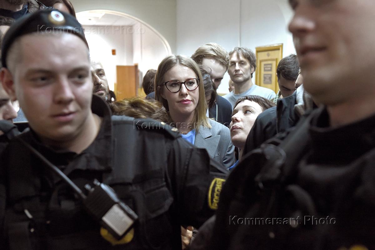 The consideration of the extension of the house arrest of Gogol Center director Kirill Serebrennikov, former general director of the nonprofit organization "Seventh Studio" Yuri Itin, former chief accountant of the nonprofit organization "Seventh Studio" Nina Maslyaeva was held in the Basmanny District Court. Journalists in front of the meeting hall. TV presenter, editor-in-chief of the Russian version of L'Officiel magazine Ksenia Sobchak (center) before the meeting.