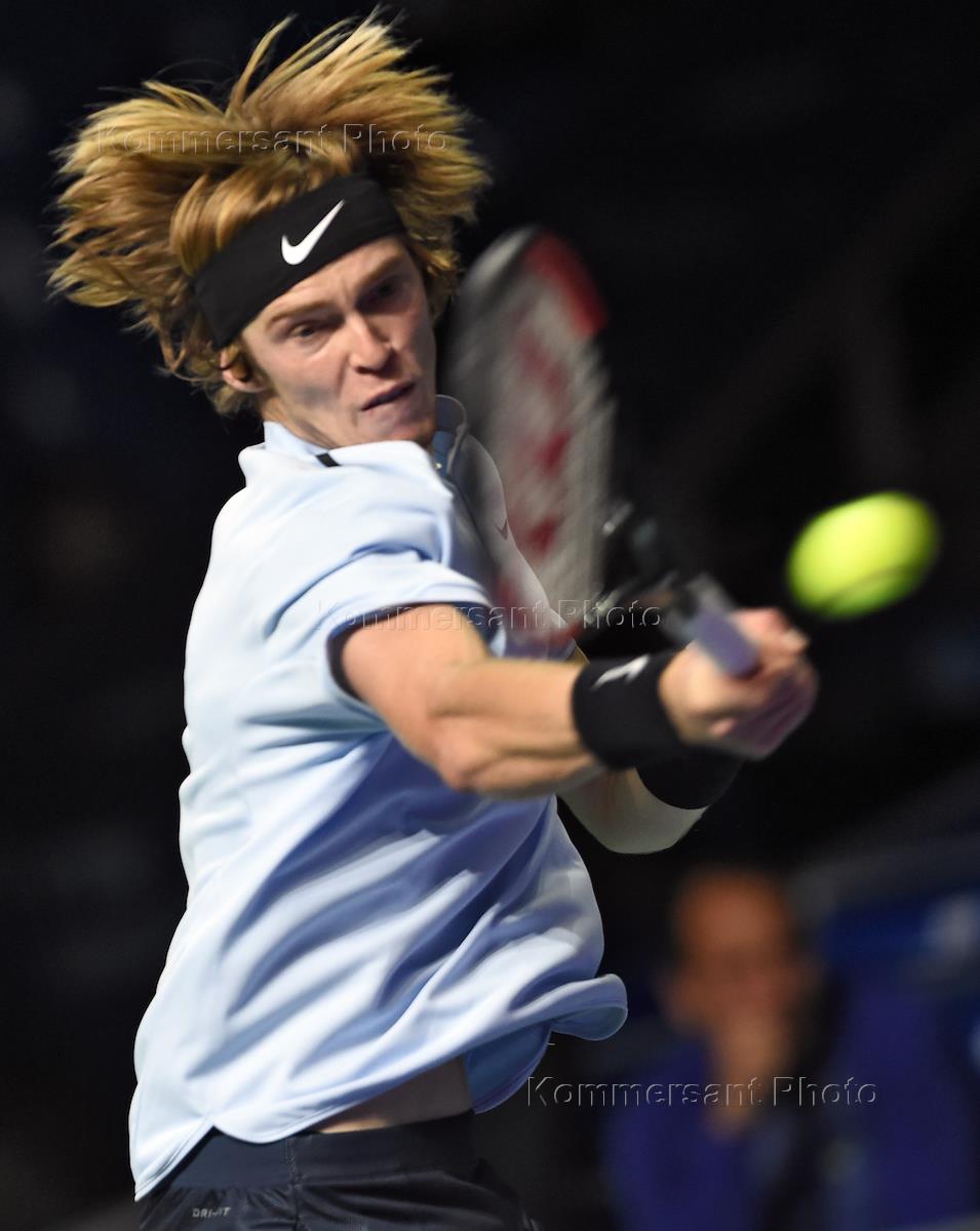 XXVIII international tennis tournament "VTB Kremlin Cup" in "Olimpiyskiy" sports complex. Slovakian tennis player Magdalena Rybarikova during a match with Russian tennis player Maria Sharapova.