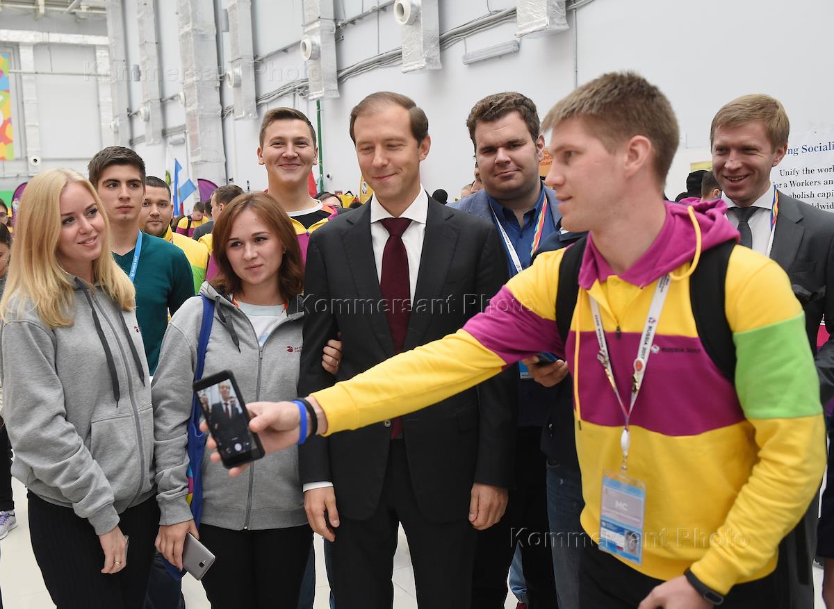 XIX Всемирный фестиваль молодежи и студентов в Сочи. День четвертый. Министр промышленности и торговли России Денис Мантуров (слева) во время фестиваля в Главном медиацентре Олимпийского парка.