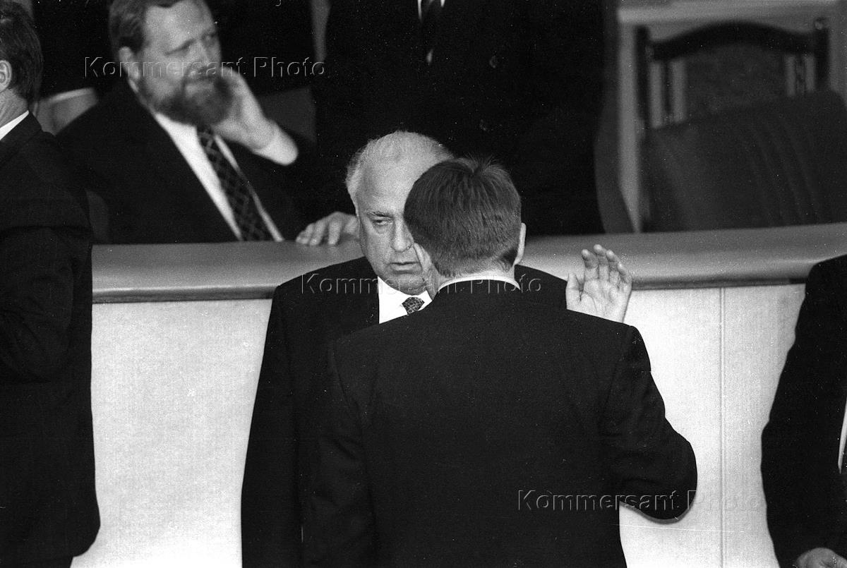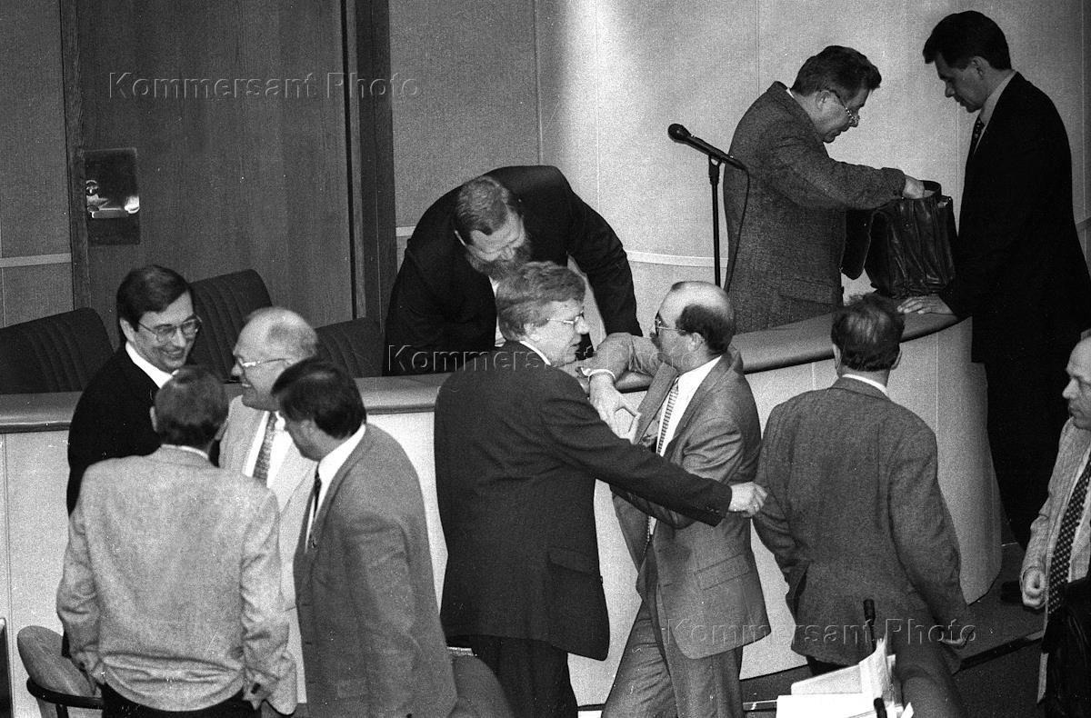 Заседание Государственной думы России. Председатель Центрального Банка России Сергей Дубинин (сторой слева) и председатель правительства России Виктор Черномырдин (справа) во время заседания.